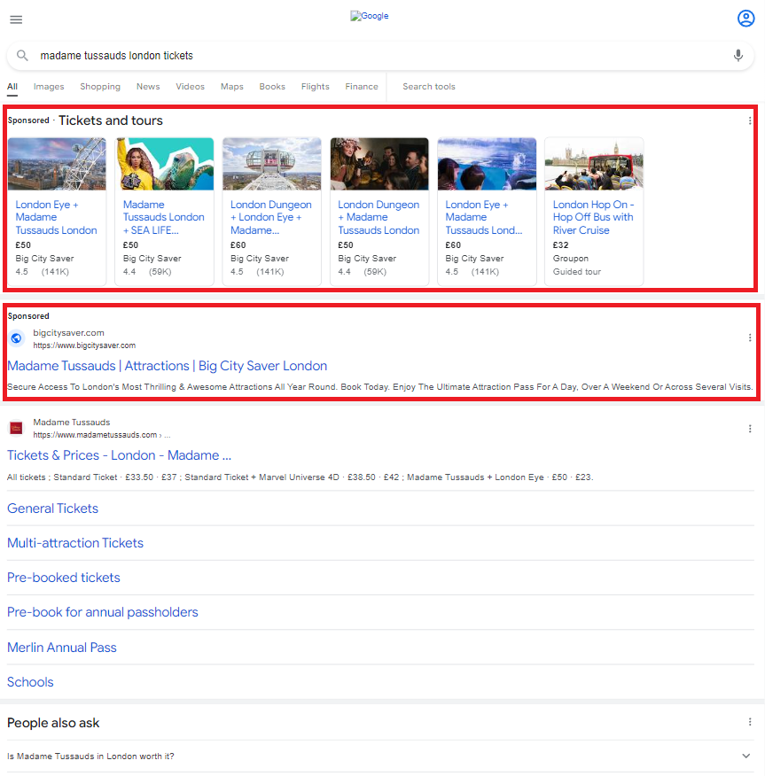 That means Madame Tussauds would need to pay monthly between €29,700 to €146,850 for showing its ads at the top of Google’s search results, just for its brand name.