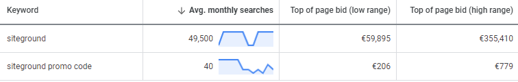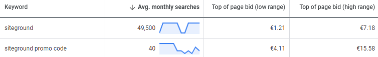 The average monthly search volume for siteground in the USA is 49,500 according to Google’s keyword planner. The estimated CPC for the top-of-the-page bids for the keyword siteground ranges from €1.21 to €7.18.