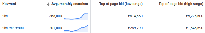 The average monthly search volume for Sixt in USA is about 368,000 according to Google’s keyword planner. The estimated CPC for the top-of-the-page bids for the keyword Suxt ranges from €1.67 to €14.20.