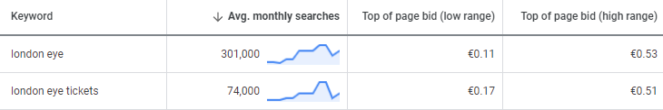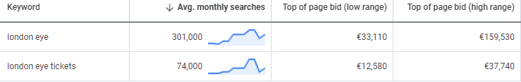 The average monthly search volume for The London Eye in the UK is over 375,000 according to Google’s keyword planner. The estimated CPC for the top-of-the-page bids for the keyword The London Eye ranges from €0.11 to €0.53.